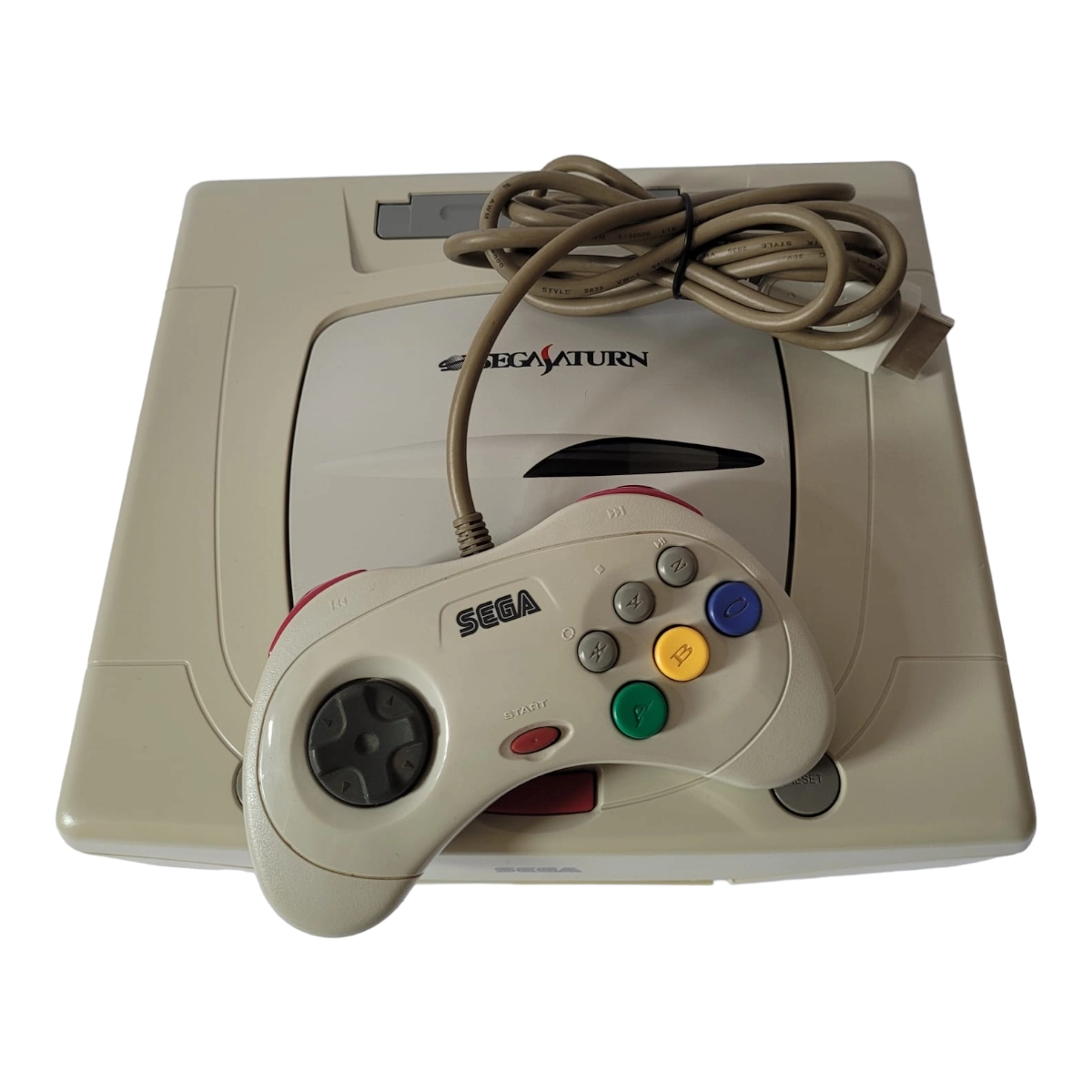 Inclui 1 console Sega Saturn branco versão All In One seminovo e 1 controle original com fio conectado ao aparelho.
